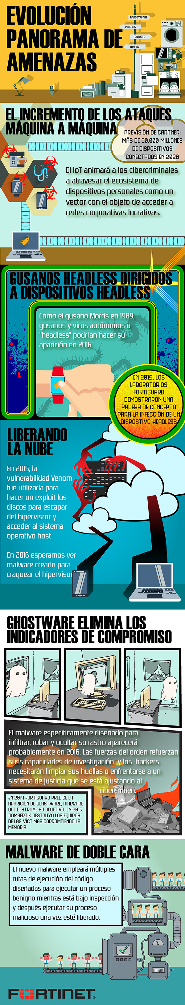 Como en años anteriores, el Internet de las Cosas (lo T) y la nube juegan un importante papel en estas predicciones, pero también nuevas tácticas y estrategias maliciosas establecerán un reto único tanto para los vendedores como para las organizaciones. FortiGuard Labs también predice que el surgimiento de técnicas de evasión altamente sofisticadas empujarán las fronteras de detección y los hackers de investigación forense enfrentarán aún más presión por parte de las autoridades en materia legal.