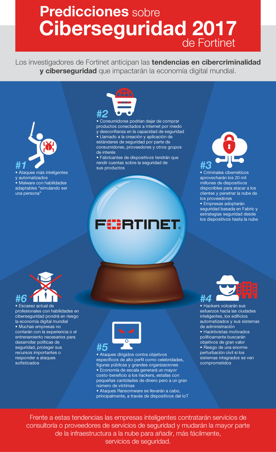 6. La Tecnología tendrá que cerrar la brecha generada por la crítica escasez en talento cibernético. La escasez actual de profesionales en ciberseguridad significa que muchas organizaciones o países que buscan participar en la economía global digital, lo harán pero corriendo grandes riesgos, ya que simplemente no cuentan con la experiencia o entrenamiento necesarios para desarrollar una política de seguridad, proteger sus recursos más importantes, que ahora se mueven libremente entre los ambientes de red, o identificar y responder a los ataques más sofisticados de hoy.