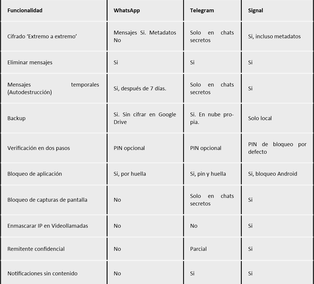 La investigadora de ESET concluye: “Cada aplicación tiene ventajas y desventajas. WhatsApp cuenta con amplias funcionalidades de comunicación y es la más utilizada, por lo que probablemente sea más práctica para comunicaciones diarias o con aquellos contactos que no utilizan otra aplicación. Sin embargo, al utilizarla se está cediendo datos e información que está siendo utilizada por el conglomerado Facebook. Telegram se ubicaría en un lugar intermedio entre Signal y WhatsApp, con una cantidad de usuarios en aumento y cada vez más popular. Si bien pertenece a una empresa privada, recopila muchísima menos información y tiene las mismas (o incluso más) prestaciones que WhatsApp. Sin embargo, si se decide utilizarla es importante recordar usar los chats secretos para las comunicaciones privadas. Por último, Signal es claramente la aplicación que mejores funcionalidades de seguridad posee, además de garantizar la privacidad de la información. Sin embargo, aún es una aplicación poco difundida y quizás muchos de los contactos no la estén utilizando”.