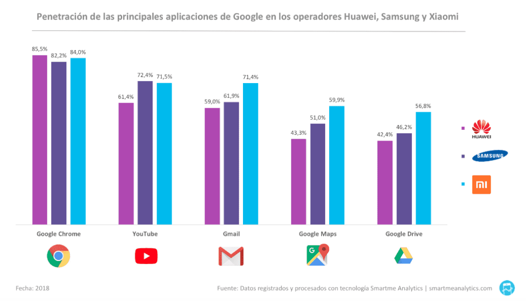 En cuanto a la penetración de las apps de Google, Chrome es el navegador utilizado con una cuota del  85,5% en el caso de los usuarios de Huawei, del 84% de los de Xiaomi y del 82,2% de los de Samsung. Según el estudio de Smartme, YouTube es la segunda App de Google más utilizada por los usuarios de Android. La usan el 72,4 de los usuarios de Samsung, el 71,5% de los de Xiaomi y el 61,4% de los usuarios de Huawei. La tercera de las grandes apps móviles de Google es Gmail, con una penetración del 71,4% entre los usuarios de Xiaomi, del 61,9% entre los de Samsung y del 59% entre los de Huawei. En el caso de Google Maps, los usuarios de Xiaomi lideran su uso, con el 59,9%, seguidos por los usuarios de Samsung, con el 51%,  y por el 43,3% de los tienen un Huawei. Finamente, Google Drive es utilizada por el 56,8% de los propietarios de un móvil Xiaomi, por el de los 46,2% de los que eligieron un Samsung y por el 42,4% de los que utilizan un Huawei.