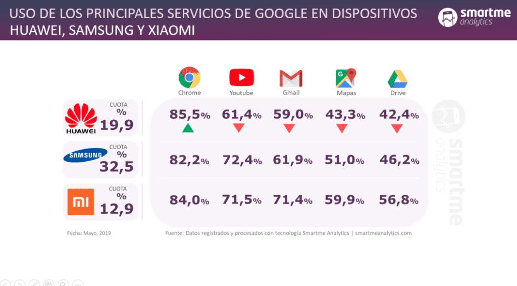 Según un estudio realizado por la compañía Smartme Analytics especializada en tecnología observacional, el 85,5% de los usuarios de Huawei utilizan Chrome, el 61,4% YouTube, el 59% Gmail, el 43,3% Google Maps y el 42,4% Google Drive