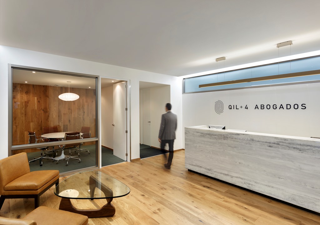 QIL+4 Abogados, también alojado en Centro Gerencial Las Margaritas, tomó la decisión de implementar este tipo de espacios abiertos y combinarlo con cubículos y oficinas cerradas para lograr un equilibrio entre espacios de colaboración y favorecer la inmediatez y transparencia.