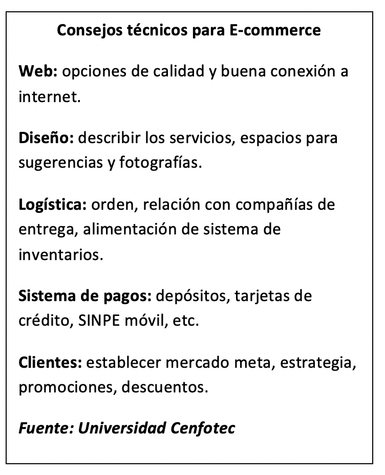 “Es importante entender que si bien es cierto, el e-commerce no requiere tanta inversión como una tienda física, si requiere recursos para adquirir la tecnología necesaria para poder realizar: catálogos, inventarios, un sitio web, facturación, comunicación y comercialización por medio de redes sociales, correo electrónico, WhatsApp y llamadas telefónicas entre otros”, explicó Alejandra Alfaro profesora de Universidad Cenfotec y experta en Mercadeo Digital.