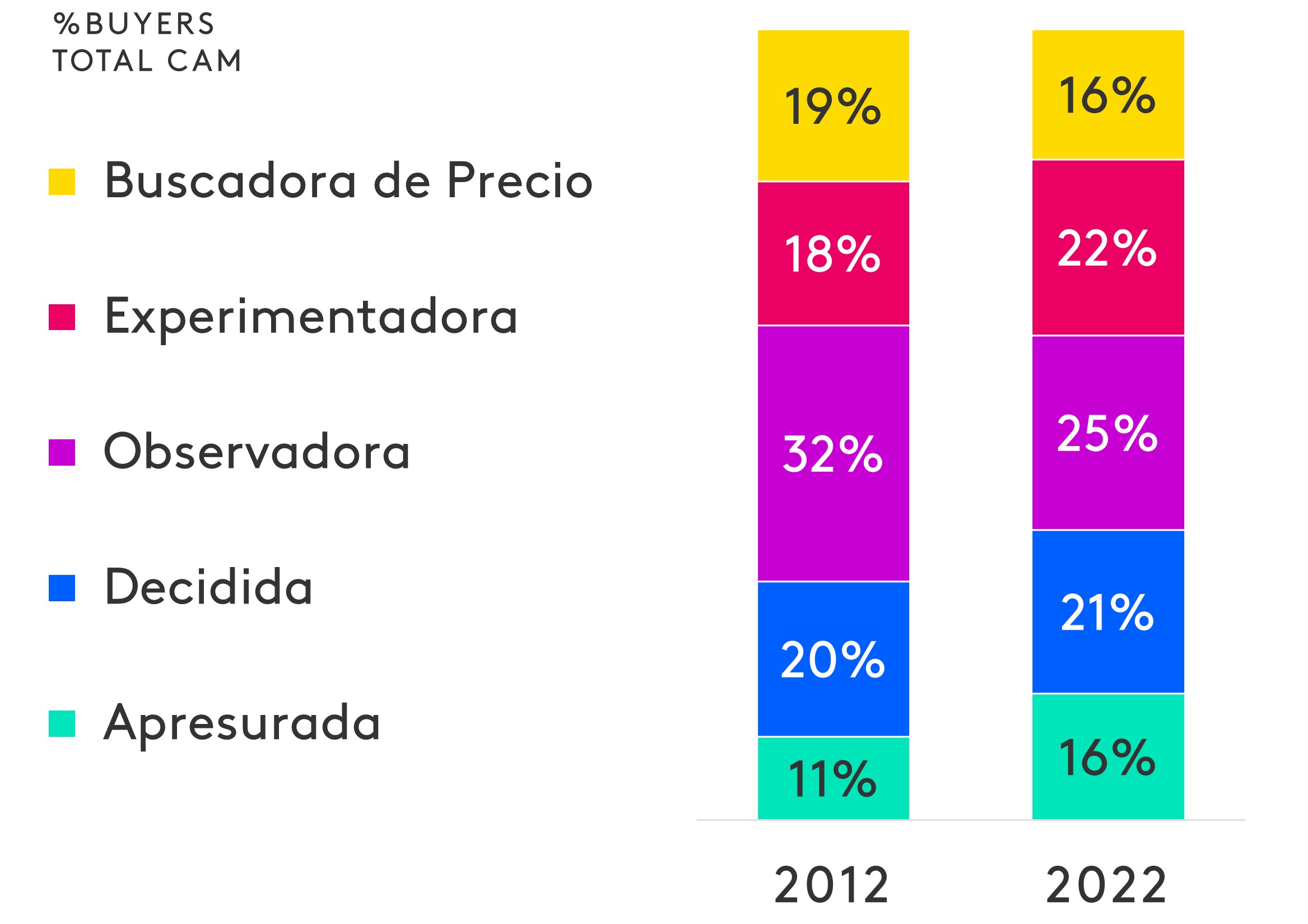 Para 2022 el 22% (18% 2012) se convierten en mujeres experimentadoras, que les gusta la innovación y lanzamientos de nuevos productos y algunas tienden a comprar por impulso y son más susceptible a substitución y cambio de marcas a partir de la experimentación y degustación.
