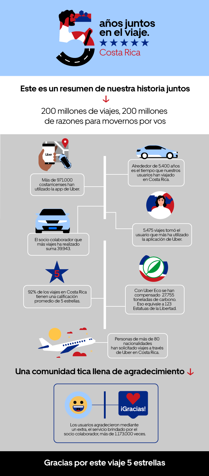 La app de Uber, desde que está disponible en Costa Rica, se ha caracterizado por darle a los costarricenses una opción de movilidad rápida, confiable, segura y todo esto a tan solo un clic. Uber está disponible en el país desde el 2015 y hace cinco años, inició el primer viaje que rápidamente se transformó en miles y desde entonces ha realizado más de 200 millones de viajes.