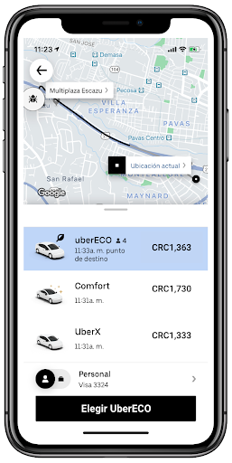 Al entrar en la app de Uber, el usuario encontrará productos que ya existen: UberX, Uber Comfort, Uber XL, Uber VIP y ahora uno nuevo: Uber Eco. Si el usuario decide viajar con Uber Eco, estará contribuyendo con un monto adicional en su viaje para estrategias que contrarrestan la huella de carbono mediante la compra de Bonos de Carbono, invertidos en Costa Rica.  De esta forma se compensa la huella generada en los viajes que se realizan.