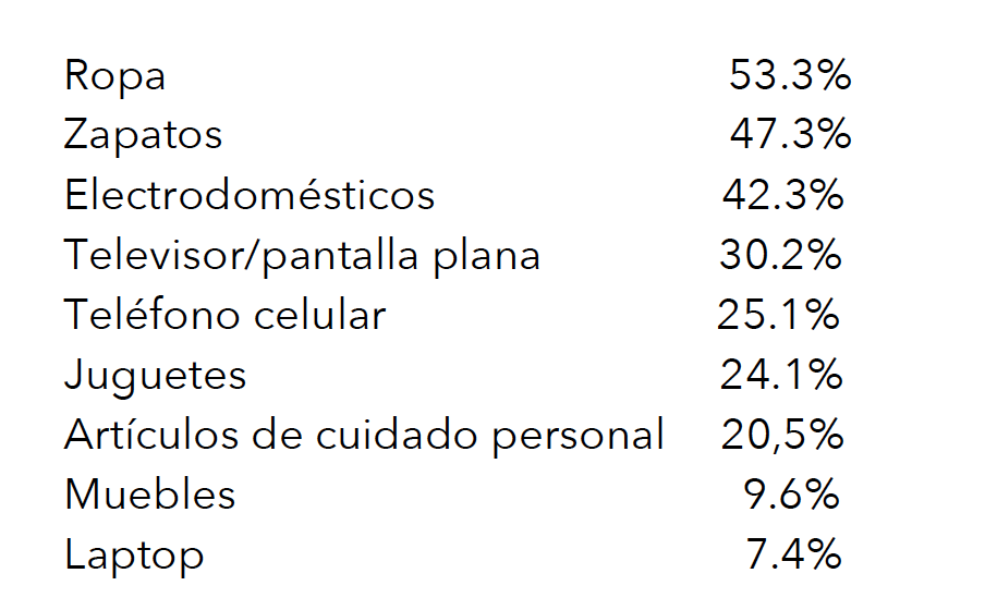 El 51% de los entrevistados dice que sí tiene intención de comprar y un 49% no lo va a hacer. Los que dijeron que sí van a efectuar compras (271 personas) mencionaron con más frecuencia los siguientes (respuesta múltiple puede sumar más de 100%)
