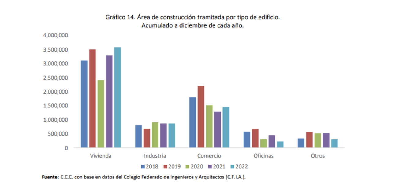 Según el informe entre enero y diciembre de 2022 se han tramitado cerca de 6,4 millones de metros cuadrados para la construcción de edificaciones. La lista está compuesta por: vivienda (unifamiliar y condominios), comercio (edificios comerciales y hoteles), industria (bodegas), oficinas (comerciales e institucionales) y otros (sitios de reunión pública, salud y edificios educacionales).