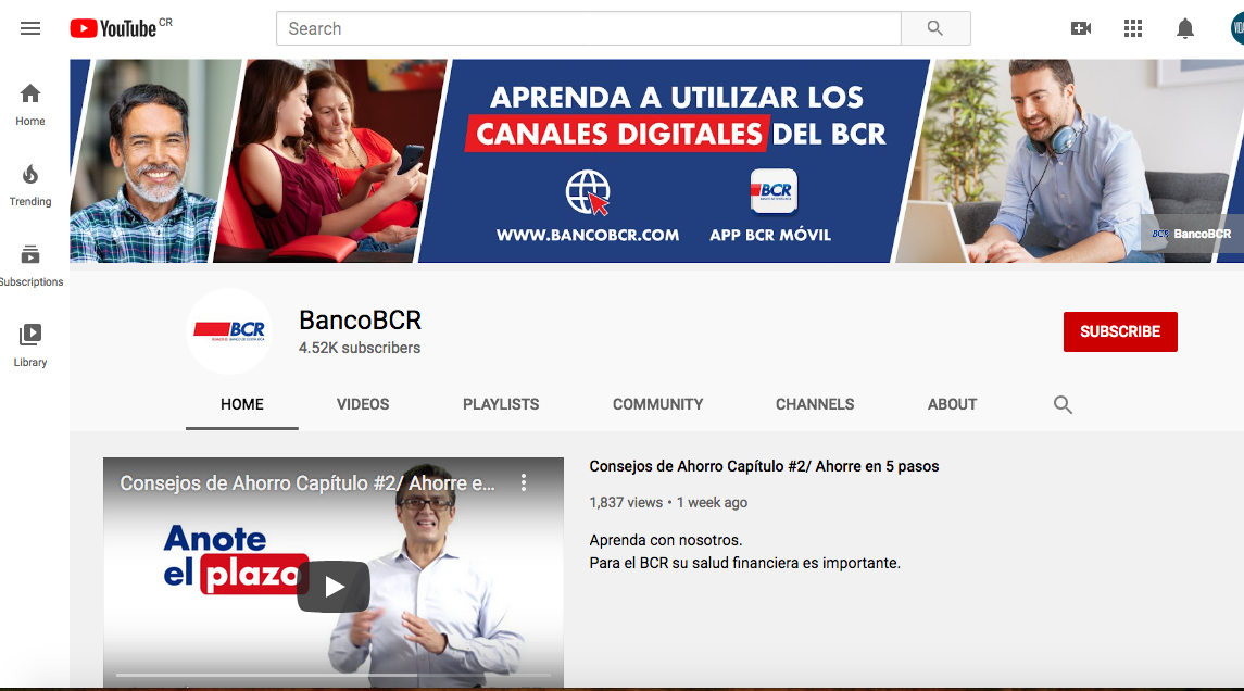 La entidad también publicó recientemente en su canal de YouTube diez tutoriales para que los clientes, desde la comodidad de su casa o trabajo, aprendan como utilizar los canales digitales del banco: App BCR Móvil y la página www.bancobcr.com.