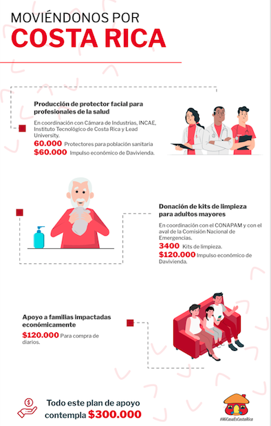 Para nuestro ejército en primera línea frente a la batalla contra el COVID- 19, Davivienda dará un impulso económico de US$60.000 al proyecto de caretas faciales que coordina la Iniciativa de Abastecimiento Local de Equipo de Protección Personal (ALEPP). Con esta donación se elaborarán 60.000 protectores, usando el diseño propuesto por el Instituto Tecnológico de Costa Rica y aprobado por la Caja Costarricense del Seguro Social. La entrega se efectuará entre el 29 de abril y el 6 de mayo.