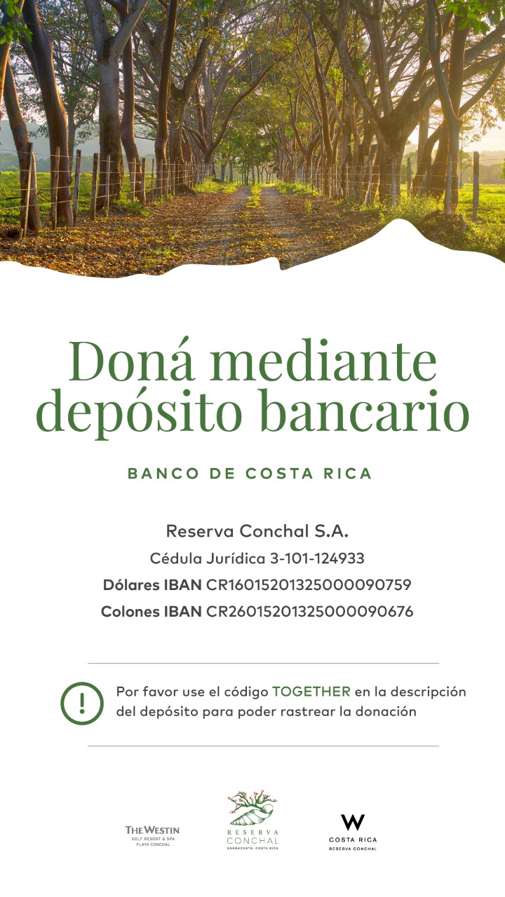 Las personas que deseen hacer donaciones lo podrán hacer en las cuentas bancarias de Reserva Conchal en el Banco de Costa Rica con el código “Together”.
