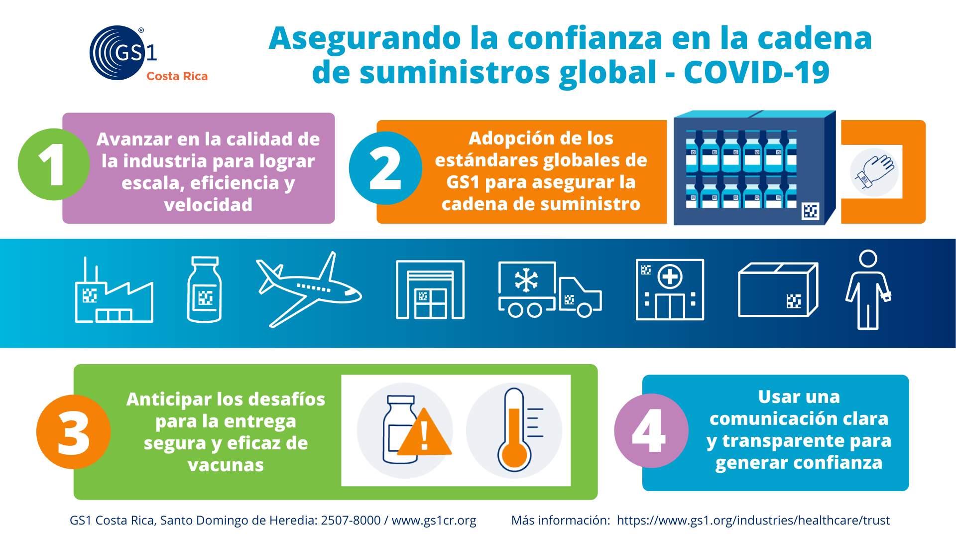 Los estándares globales GS1 permiten a los fabricantes de productos farmacéuticos, las empresas de distribución y los proveedores de atención médica seguir protocolos y medidas de seguridad fundamentales para garantizar la confianza del público, tanto de la vacuna en sí misma, como en la capacidad de implementar las vacunas de manera segura.