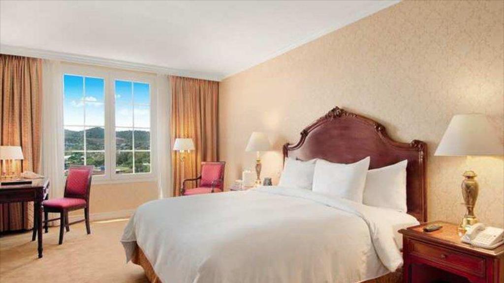Las amplias y luminosas habitaciones de Hilton Pilar cuentan con un diseño contemporáneo, con grandes ventanales y cuadros abstractos impresionantes.