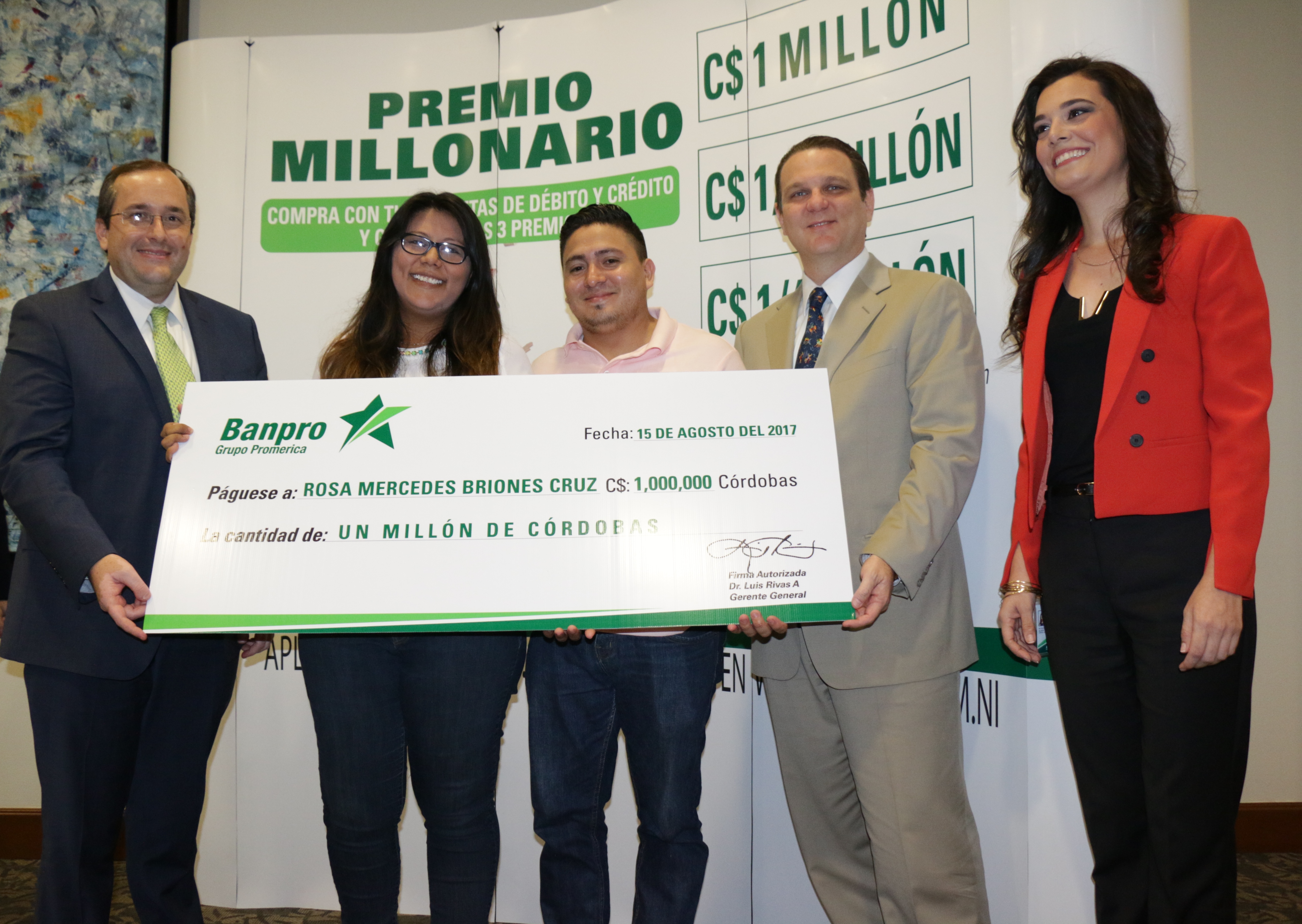Rosa Mercedes Briones  Cruz fue la feliz ganadora del primer premio de la promoción “Premio Millonario Premia Banpro Mamá y Papá 2017”, consistente en un millón de córdobas, los otros