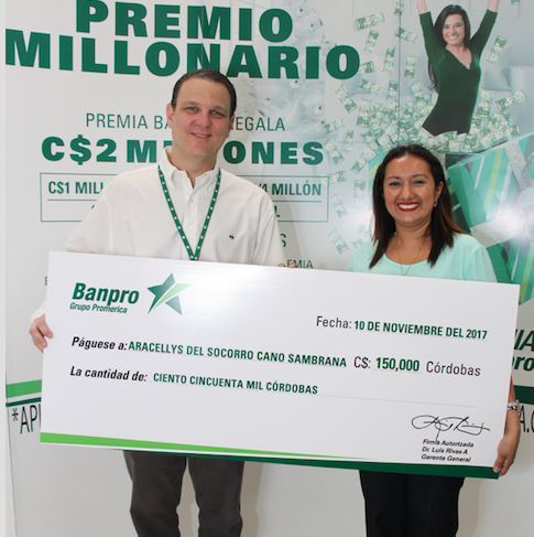 Juan Carlos Gurdian, gerente de negocios de personas de Banpro Grupo Promerica entregó el segundo de cinco premios de la promoción “Premio Millonario Navidad 2017”, a Aracellys del Socorro Cano