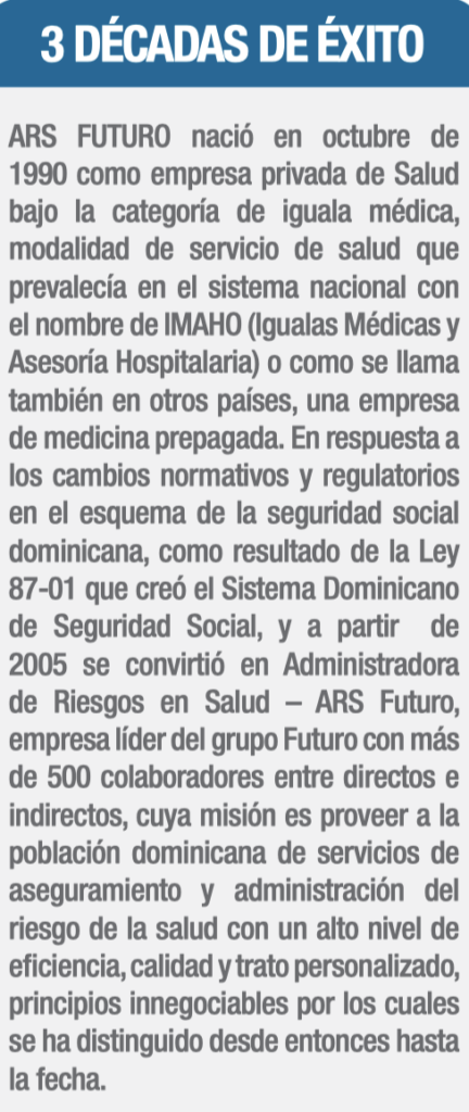 Con 30 años de experiencia en el mercado de seguros de República Dominicana, ARS Futuro se posiciona como uno de los grupos aseguradores de salud más experimentados del país, tanto en el esquema actual de medicina prepagada, como en la implementación del seguro familiar de salud (SFS) de la Seguridad Social.