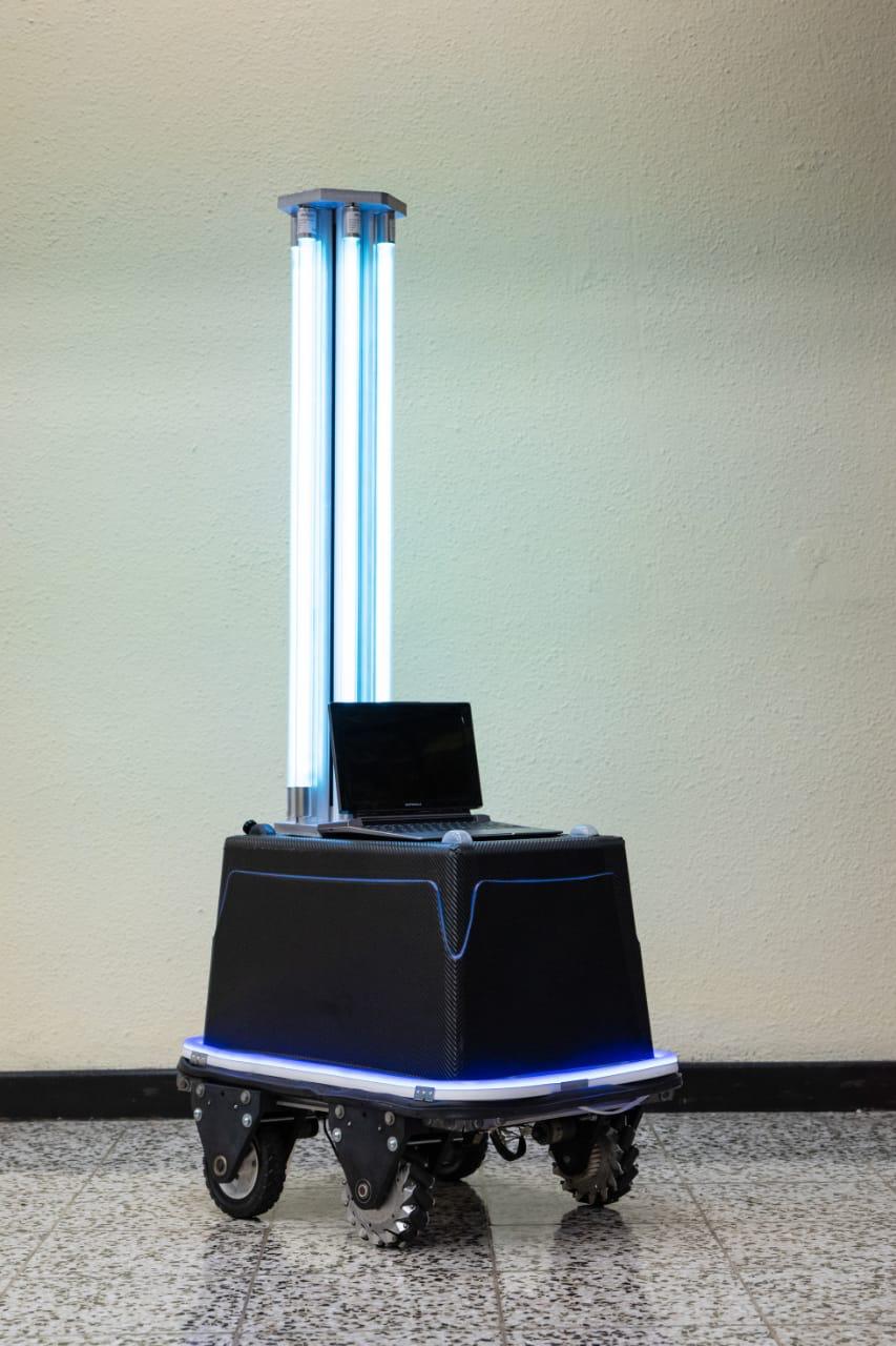 Para desinfectar utiliza luz ultravioleta del rango C, que se ha usado desde hace tiempo en la industria pero es dañina para el ser humano, por lo que es ideal que sea manipulada por un robot en espacios vacíos donde no haya gente.