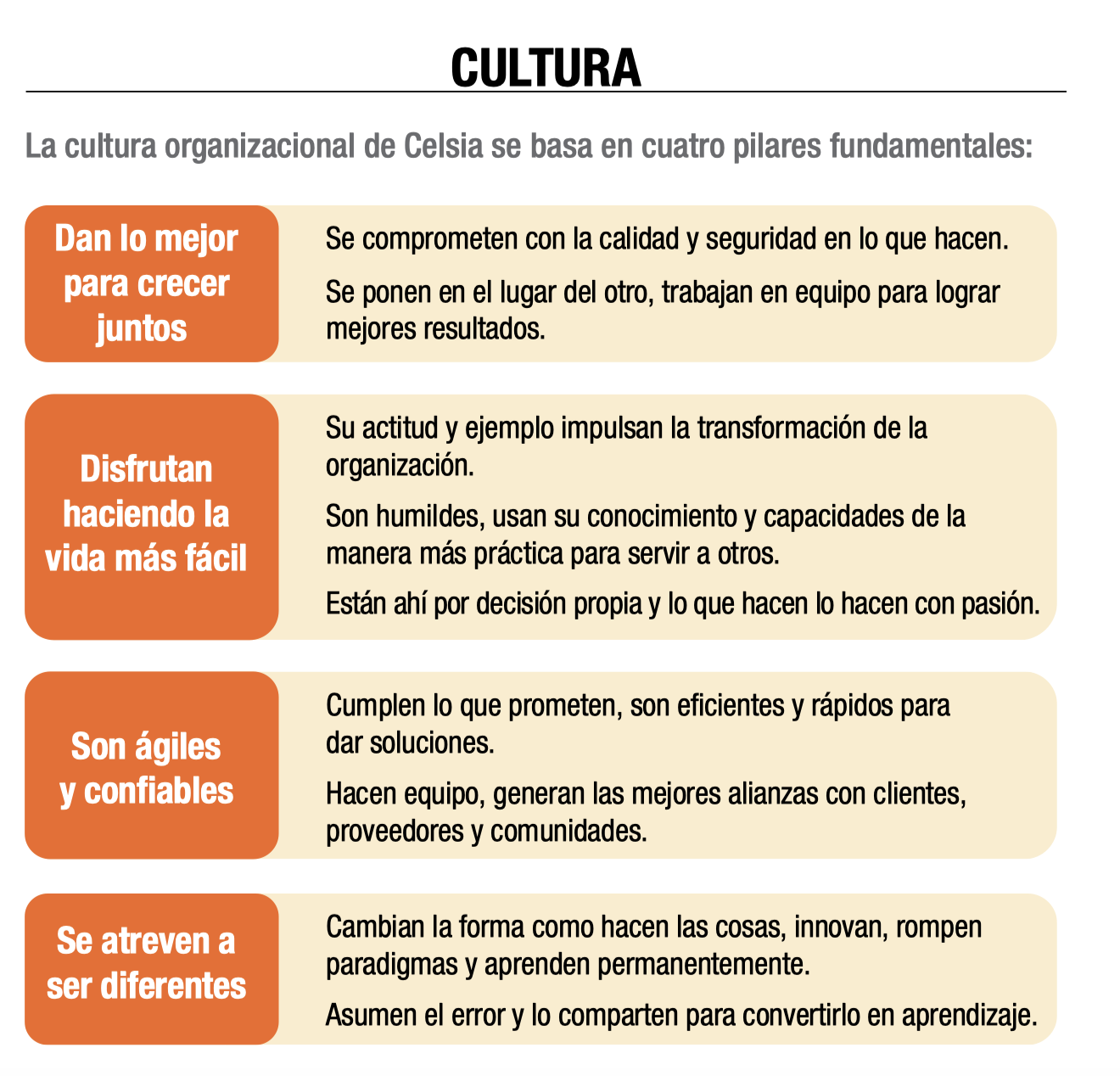 “Las compañías compiten con productos, modelos de negocio y estrategias de mercado; si bien con estas herramientas se generan algunas diferencias, lo que realmente marca la ventaja es lo que está adentro, su cultura. La nuestra es la Cultura de la Buena Energía y en Celsia la vivimos a través de cuatro pilares”, comentan los voceros de la compañía.