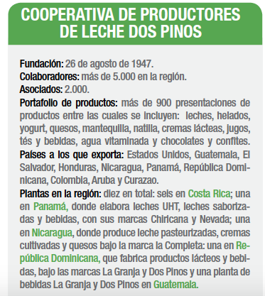 Dos Pinos genera 5.200 empleos en la región -4.722 sólo en Costa Rica-, beneficia a 70.000 familias a través del modelo cooperativo y enlaza sus operaciones con 6.000 proveedores, de los cuales 900 son pequeñas y medianas empresas costarricenses.