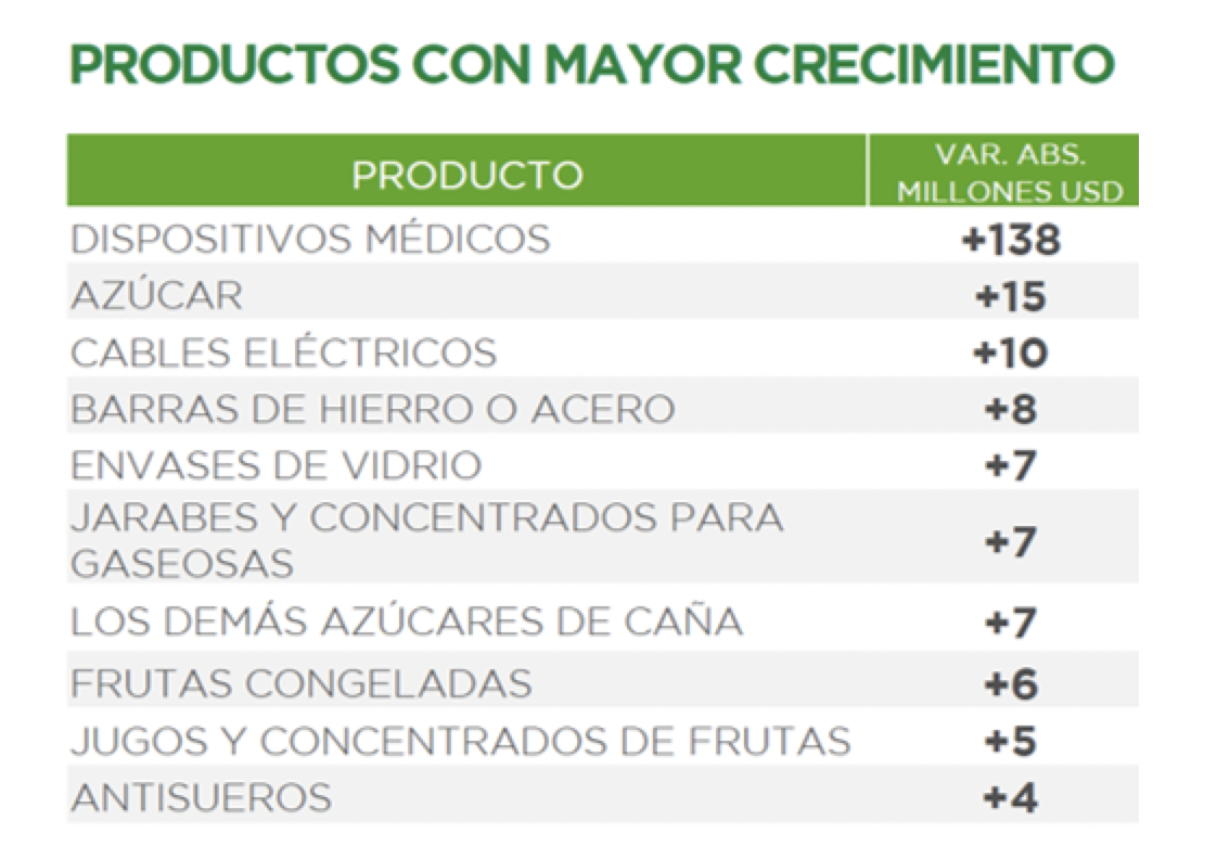 A nivel de mercados de exportación, todos crecen. Se presenta un incremento en América del Norte (+11%) explicado por aumento en los envíos de dispositivos médicos, azúcar y banano; en América Central (+8%) por jarabes para gaseosas, cables eléctricos y medicamentos; el Caribe (+23%) por envases de vidrio y barras de hierro o acero; en América del Sur (+32%) por jarabes para gaseosas y preparaciones para bebidas.