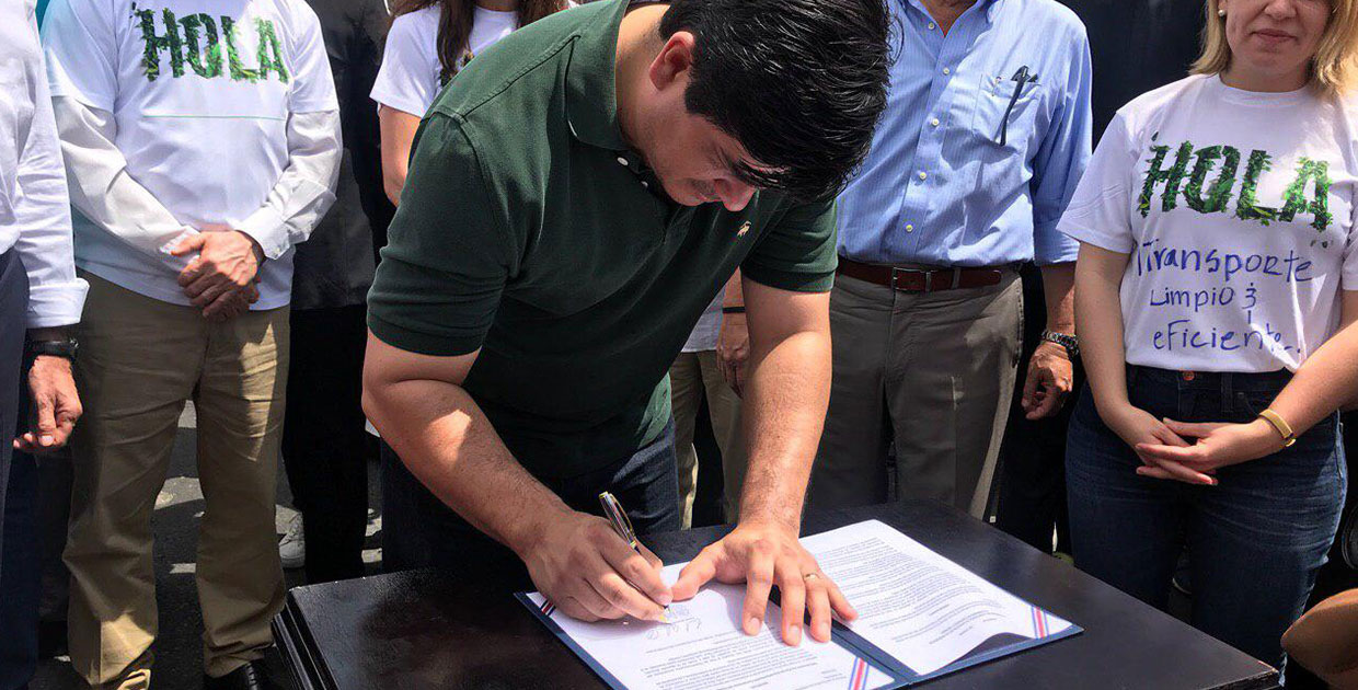 Aparte de firmar el decreto ejecutivo que formaliza el Plan Nacional de Descarbonización 2019-2050, los jerarcas del Ministerio de Ambiente y Energía (MINAE) y del Ministerio de Obras Públicas y Transporte (MOPT) firmaron un acuerdo intersectorial para la reducción de emisiones de gases de efecto invernadero en el sector transporte.