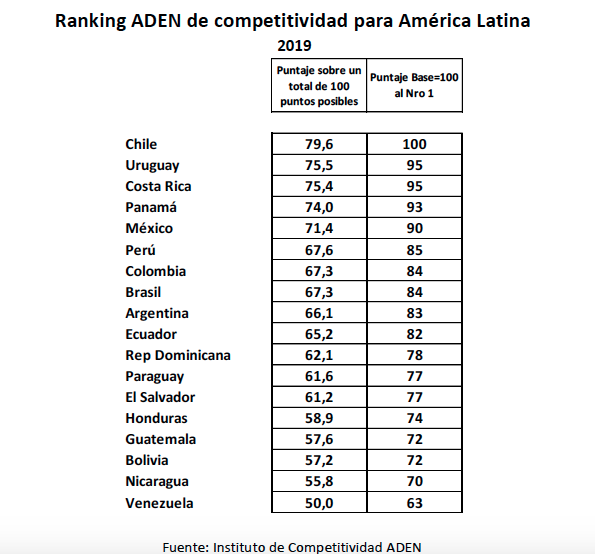 Este ranking de competitividad para América Latina es realizado por el Instituto de Competitividad de ADEN