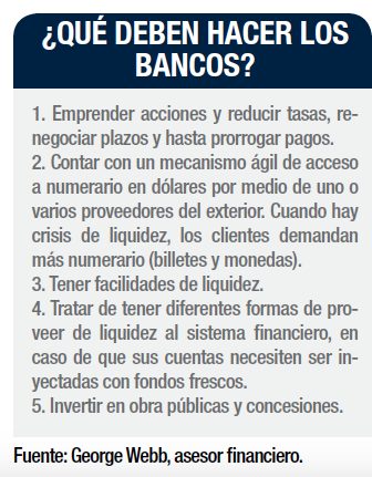 Para Webb, los bancos y las entidades financieras sobrevivirán a la pandemia. En el caso de la banca estatal, se cuenta con el respaldo del gobierno que interviene con fondos públicos. Igualmente, la banca privada es muy robusta y tiene un fuerte capital. Lo que sí está claro, es que habrá una afectación generalizada ante la posibilidad de no pago de muchos de los créditos por sus deudores.