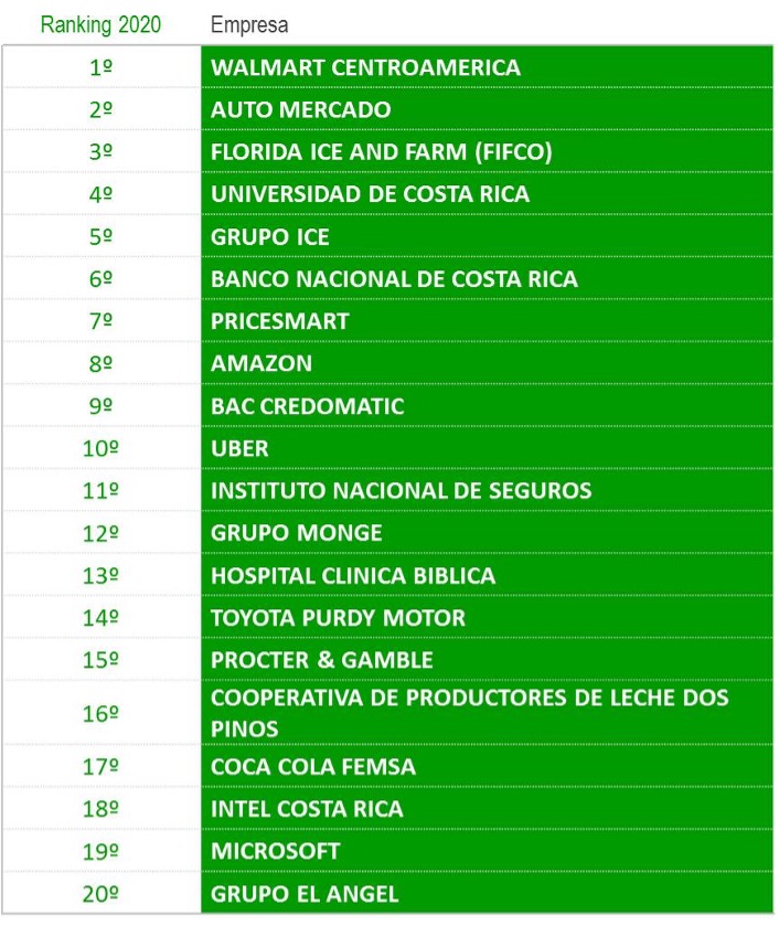 En 2020, mantienen sus posiciones en el podio las mismas tres empresas que en 2019: Florida Ice and Farm (1º), Auto Mercado (2º) y Cooperativa de Productores de Leche Dos Pinos (3º). Completan el top ten Grupo Purdy, que sube del 5º al 4º lugar; Intel Costa Rica, que también asciende una posición hasta la 5ª; BAC Credomatic, en el 6º puesto; Walmart Centroamérica, manteniendo la 7ª posición; Banco Nacional de Costa Rica, que sube del 14º al 8º puesto; Coca Cola Femsa, en el 9º; y Amazon, que pasa del 15º al 10ª lugar.