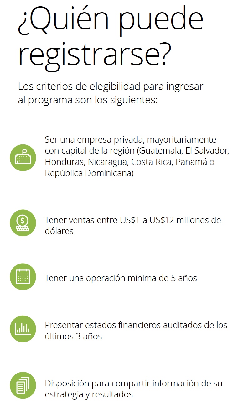 Las empresas interesadas en participar deben cumplir con los siguientes criterios de elegibilidad: Ser una empresa privada, mayoritariamente con capital de la región (Guatemala, El Salvador, Honduras, Nicaragua, Costa Rica, Panamá o República Dominicana), tener ventas entre US$1 a US$12 millones, una operación mínima de 5 años, presentar estados financieros auditados de los últimos 3 años y disposición para compartir información de su estrategia y resultados.