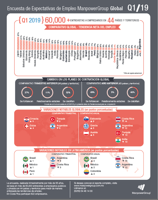 De acuerdo con la Encuesta de Expectativas de Empleo publicada  por ManpowerGroup, los empleadores en Costa Rica prevén un nivel moderado de contratación para el primer trimestre del 2019. De los 622 empleadores entrevistados, 12% esperan incrementar su fuerza laboral, 76% no reportan cambios y 6% no saben. Después de aplicar el ajuste estacional el resultado de la Encuesta de Expectativas de Empleo es de +4% para el primer trimestre del 2019.