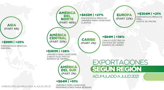 Las exportaciones de bienes de Costa Rica continúan con dinamismo al alcanzar la cifra de US$8.338 millones a julio del 2021, es decir US$1.759 millones más -27%- que en el mismo periodo del año anterior.