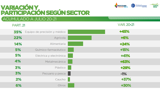 Al analizar las estadísticas por sector, equipo de precisión y médico tuvo un crecimiento de 45% y continúa como el de mayor importancia con una participación de 35%; la industria alimentaria incrementó un 24%, químico farmacéutico un 15%, eléctrica y electrónica 41%, metalmecánica tuvo un importante aumento de 63%, plástico creció 29% y caucho 37%.
