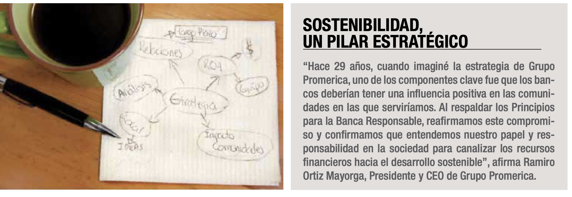 Grupo Promerica está presente en nueve países: Guatemala, El Salvador, Honduras, Nicaragua, Costa Rica, Panamá, República Dominicana, Islas Caimán y Ecuador. Los activos de sus nueve bancos suman aproximadamente US$15.300 millones, y es un caso muy singular al ser uno de los pocos grupos regionales de capital centroamericano que existe. Su principal accionista es Ramiro Ortiz Mayorga, quien hace 29 años se atrevió a dibujar esta estrategia bancaria en una servilleta de papel. Los fundamentos de ese gráfico tenían como eje el impacto positivo que, de acuerdo con su sueño, debían tener los bancos.