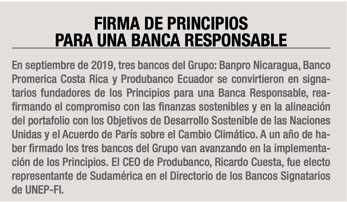 Produbanco, en alianza con Conservación Internacional (CI-Ecuador),impulsa el programa para la conservación de los páramos del Ecuador por su importancia en la regulación de los recursos hídricos. Banco Promerica Honduras ha desarrollado una serie de capacitaciones virtuales orientadas a impulsar la evolución e innovación, con enfoque tecnológico, financiero y negocios.