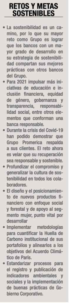 La principal meta sostenible en la actualidad es ayudar a sus clientes a superar de forma responsable y sostenible la emergencia sanitaria ocasionada por el Covid- 19. Esta situación les ha dado la oportunidad de ejercer sus valores, como el fortalecimiento de su banca de relaciones con clientes, practicando empatía, confianza mutua y colaboración.