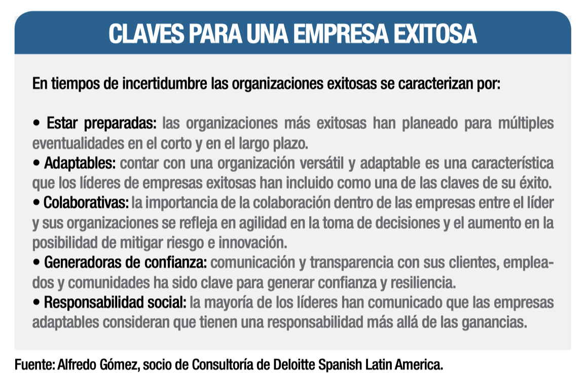 “La nueva normalidad, posterior al COVID-19 genera gran incertidumbre. El nuevo panorama al que se enfrentan los líderes de las empresas ha significado una evolución y evaluación constante de las condiciones de negocio. Sin embargo, muchas organizaciones sacaron provecho de esta difícil situación para acelerar las tendencias que ya estaban en marcha previo a la pandemia, entre ellas: colocar a los clientes en el centro de la estrategia, la digitalización, enfoque en los fundamentos del negocio y un incremento por la adopción de responsabilidad social empresarial”, recalca Alfredo Gómez, socio de Consultoría de Deloitte Spanish Latin America.