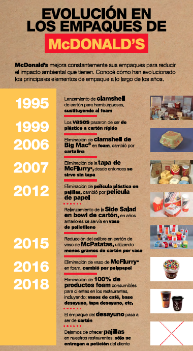 Desde hace algunos años McDonald’s viene trabajando en concientizar sobre la recolección y reciclaje de sus envases en los restaurantes; ahora trabaja en encontrar alternativas sostenibles a las pajillas de plástico; y ya se está probando diferentes soluciones al desafío de empaques sustentables por medio de pilotos en varios países del mundo.