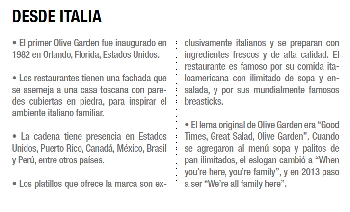 Italia fue la fuente de inspiración de Bill Darden, para crear los restaurantes Olive Garden, en 1982, en Orlando, Florida, Estados Unidos. Esta cadena de comida italiana es una división de Darden Restaurants, que desde sus inicios ha buscado darle un lugar preponderante a la familia, con excelentes platillos, una lista de vinos galardonada y la calidez y hospitalidad que caracteriza al pueblo italiano.
