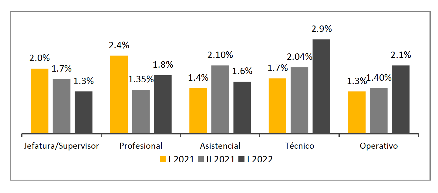 En cuanto a incrementos en los salarios de acuerdo el nivel jerárquico, se observó que las posiciones Técnicas fueron las que presentaron la mayor variación, con un 2,9%, en el primer semestre del 2022, mientras que el resto de los niveles presentaron variaciones se mantuvieron en un rango de incrementos que oscila entre 1,3% y 2,1%.