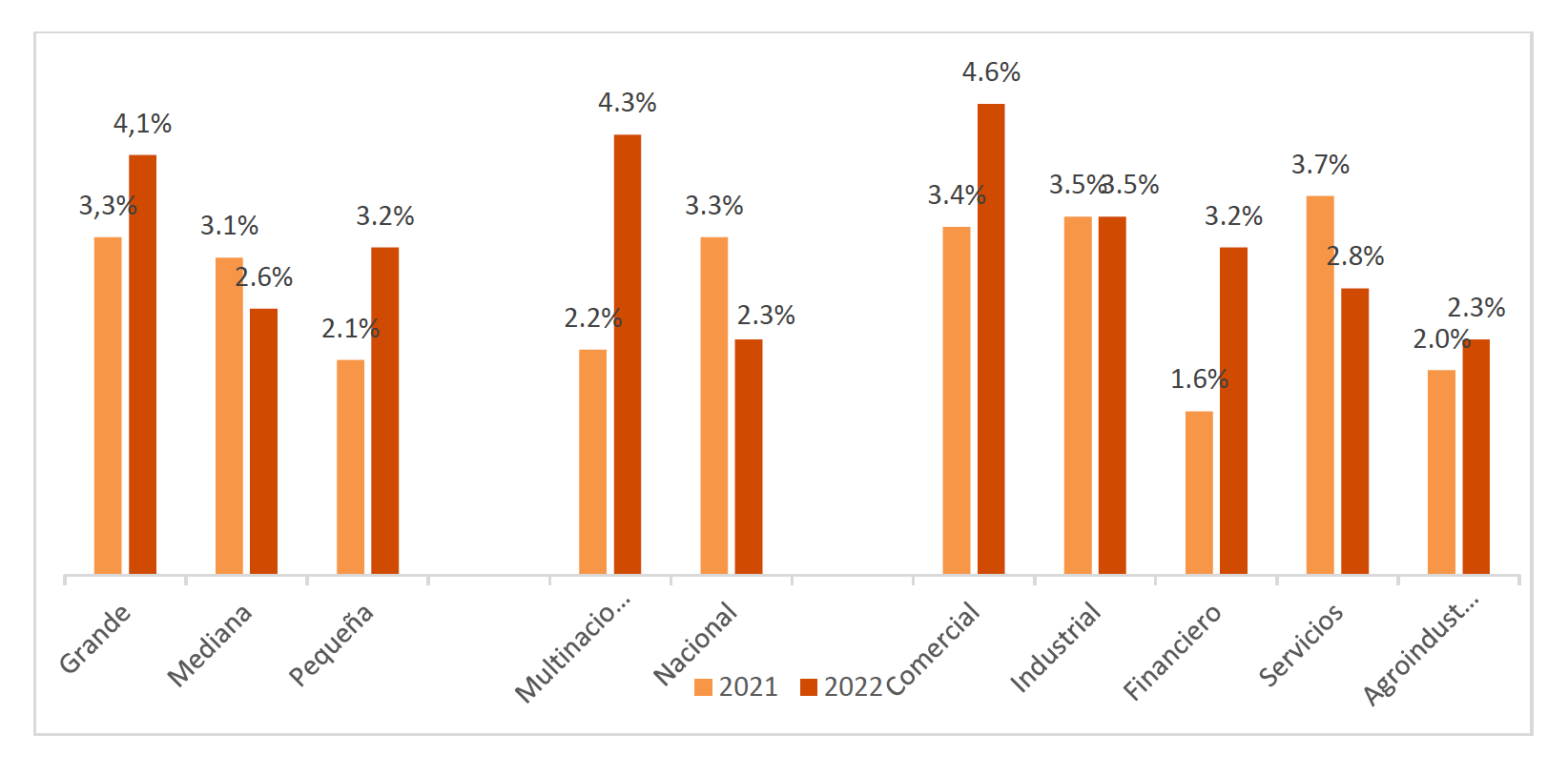 Bajo la misma línea, el estudio reveló que las empresas del sector industrial, comercial y servicios fueron las que en promedio otorgaron los mayores incrementos salariales. Los menores incrementos en el periodo 2021 fueron otorgados en las empresas del sector agroindustrial.